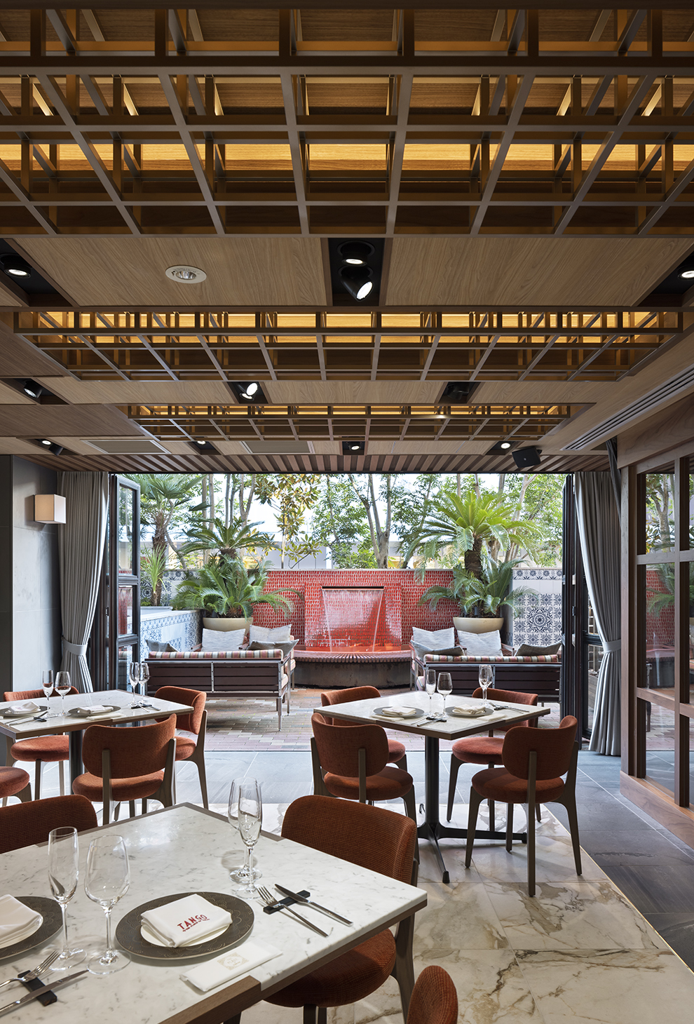 空間デザインの主役はあくまで東京タワー。私たちのインテリアデザインは、その荘厳な姿を最もドラマチックに切り取るための「舞台装置」。ガーデンテラスは、かつての「リゾート」という非日常感を、より成熟した「都会のサンクチュアリ」へと昇華させました。水音と緑、そして夜空に聳える光の塔が一体となる五感の体験を研ぎ澄ませています。